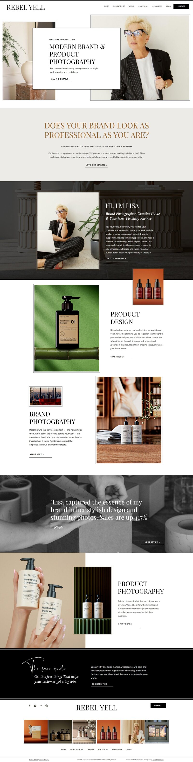 Clean lines, modern typography, and generous white space paired with warm photography blocks makes this the perfect template for graphic designers, photographers, or brand strategists.